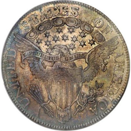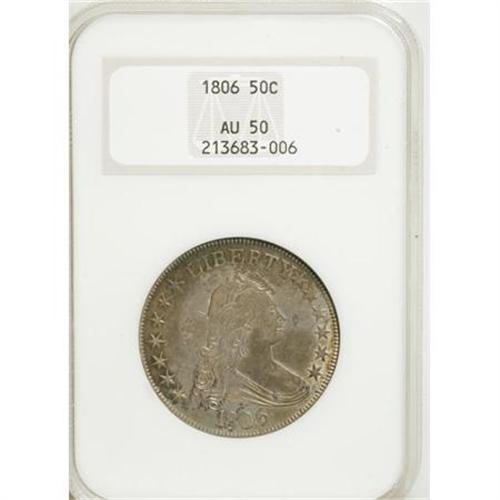 <B>1806 50C Pointed 6, Stem AU50 NGC.</B></I> O-118a, R.3. Colorfully toned in olive-green, powder-blue, lilac, and peach shades. Luster shimmers from design recesses. The strike is uncharacteristically sharp on the clouds and reverse stars, although some softness is found on the hair ribbon and lower left (facing) wing. Free from consequential contact, and encased in a former generation holder.<BR><I>From The Parker Lee III Collection.</B></I><BR><BR><B>Coin Engraver:</B> Robert Scot<BR><BR><b>Shipping:</b> Coins & Currency (<a target="_blank" href="http://www.heritageauctions.com/common/shipping.php">view shipping information</a>)