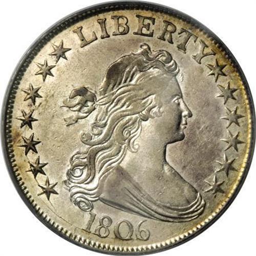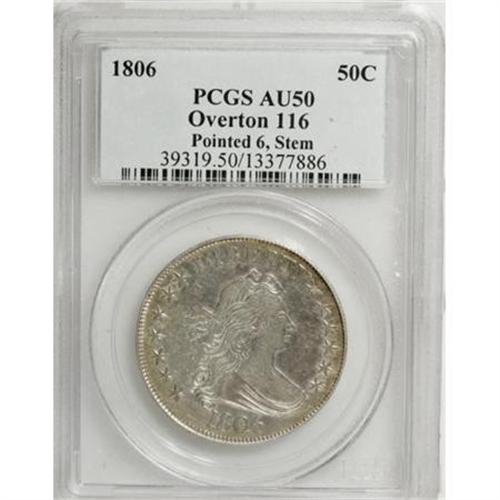 <B>1806 50C Pointed 6, Stem AU50 PCGS.</B></I> O-116 prime, R.3. Third use of Obverse 9. Paired here with a reverse that was used two more times, but both of those were only briefly used to create R.8 coins (O-128, 129). On this advanced state of Obverse 9, there is lessened repunching visible on the Y in LIBERTY and none of the die defect at the top of the 6 remains. The die cracks on the lower and left part of the obverse are obvious, but Overton mentions a crack at the top of LIBER on the O-115a. This crack is not present on this piece, suggesting the Reverse L coins may have been struck before the O-115a pieces. This coin is a prime die state as seen by the lack of the normally seen die crack on the lower and left periphery of the reverse. <BR> This high grade example is bright overall with just a hint of pale golden color around the margins. Sharply struck, except on the forecurls of Liberty's hair. Significant amounts of original mint luster remain around the outer devices and the recesses of the eagle's wings. This may well be the finest O-116 prime known.<BR> Beistle 7-F, Overton-31, PCGS # 39319, Encyclopedia-4591.<BR><I>Ex: Sheridan Downey (5/2001).<BR>From The Westmoreland County Collection of Early Bust Halves, 1794-1807.</B></I><BR><BR><B>Coin Engraver:</B> Robert Scot<BR><BR><b>Shipping:</b> Coins & Currency (<a target="_blank" href="http://www.heritageauctions.com/common/shipping.php">view shipping information</a>)