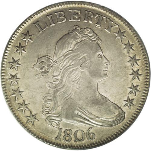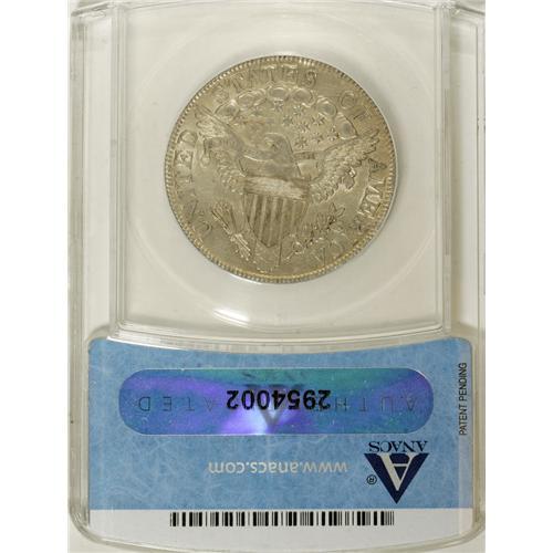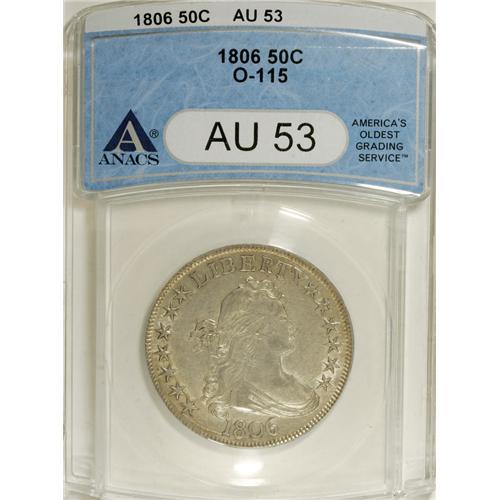 <B>1806 50C Pointed 6, Stem AU53 ANACS.</B></I> O-115, R.1. In between O-115 and O-115a, with a die crack atop STATES but no crack through LIBERTY. Luster fills the borders and devices, and both sides are surprisingly unabraded. The strike is typical near the eagle's beak, but the clouds and bust truncation are well brought up.<BR><I>From The Hoosier Discovery Collection.</B></I><BR><BR><b>Shipping:</b> Coins & Currency (<a target="_blank" href="http://www.heritageauctions.com/common/shipping.php">view shipping information</a>)