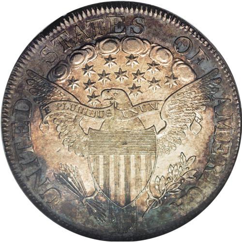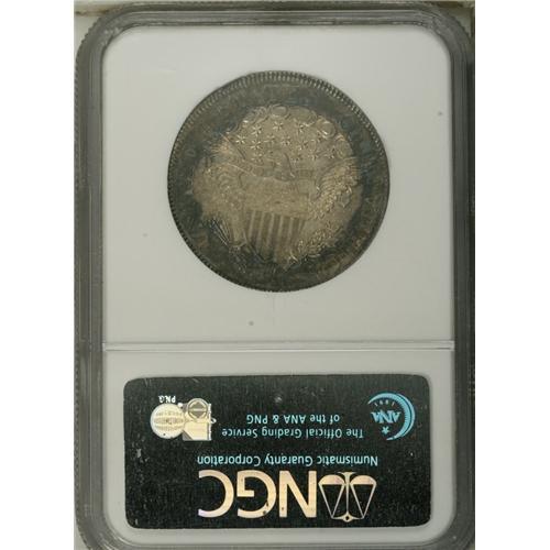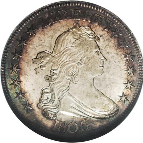 <B>1806 50C Pointed 6, Stem AU58 NGC.</B></I> O-118a, R.3. A middle to late die state with the die crack through the O in OF to the clouds, and another from the rim to the shield through the arrow shafts. The light golden-brown centers are bounded by deeper sea-green and mauve peripheries. Lustrous and pleasing for the grade.<BR><BR><b>Shipping:</b> Coin/Currency (<a target="_blank" href="http://www.heritageauctions.com/common/shipping.php">view shipping information</a>)