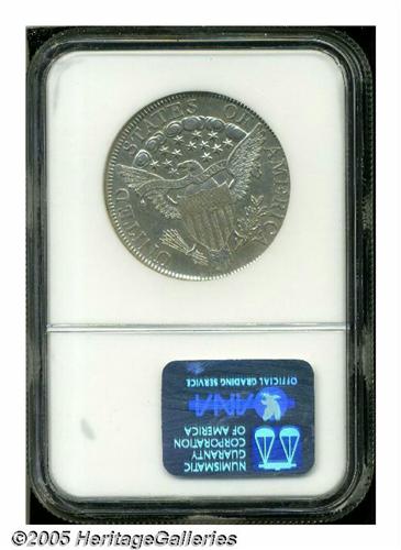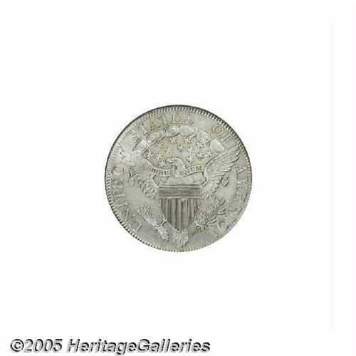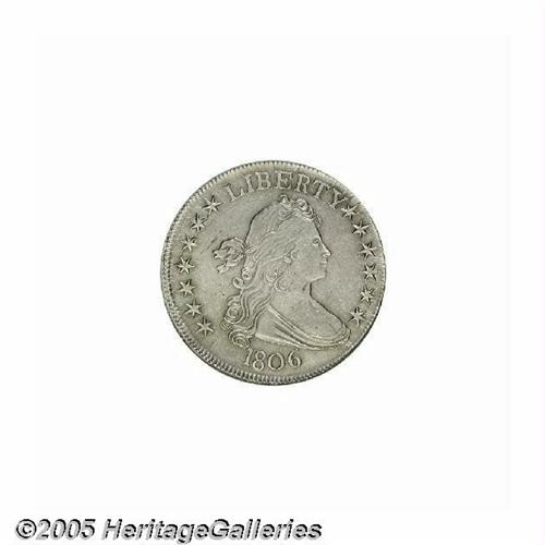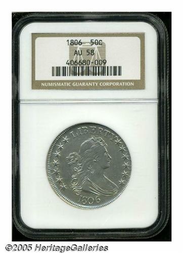 <B>1806<50C> Pointed 6, Stem AU58 NGC.</B></I> O-120a, R.4. The later die state with a noticeable die break or 'cud' atop the fourth vertical stripe of the shield. This impressive Draped Bust Half Dollar has hints of chestnut color that overlay the smooth stone-gray surfaces. Boldly struck, even the eagle's breast feathers are clear. Luster is extensive, but does not quite penetrate the open fields. Struck from clashed dies.