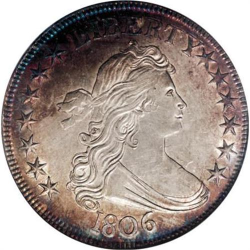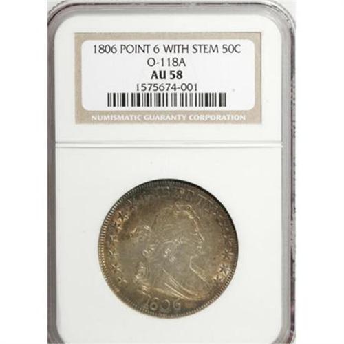 <B>1806 50C Pointed 6, Stem AU58 NGC.</B></I> O-118a, R.3. Obverse 10 was used on six die marriages, and O-118 was the first. Reverse N is a single-use die, and from this advanced die state it is easy to see why. Multiple die cracks are seen across the reverse. The best description of these is in Overton, and all are present on this piece. <BR> This is a high-end "super slider" coin that retains almost complete mint luster. The surfaces are bright and each side displays reddish-russet toning around the margins with hints of occasional blue. Well struck in all areas with no obvious or mentionable marks on either side. <BR> O-118 is one of the few 1806 halves that is available in high grades, which suggests a hoard may have existed at one time. The Condition Census for the ‘a' sub-variety is 65/65, 64/64, 63/64, 63/63, 62/62.<BR> Haseltine-7, Beistle 4a-Ha, Overton-34, PCGS # 6071, Encyclopedia-4591.<BR><I>From The Westmoreland County Collection of Early Bust Halves, 1794-1807.</B></I><BR><BR><B>Coin Engraver:</B> Robert Scot<BR><BR><b>Shipping:</b> Coins & Currency (<a target="_blank" href="http://www.heritageauctions.com/common/shipping.php">view shipping information</a>)