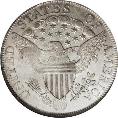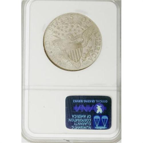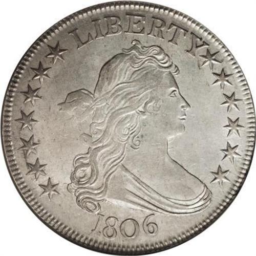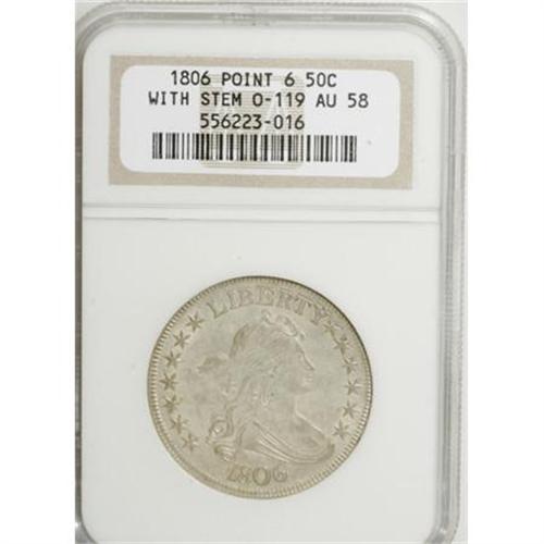 <B>1806 50C Pointed 6, Stem AU58 NGC.</B></I> O-119, R.3. Design weakness at the back of the head and hair ribbon, and also on the lower left (facing) wing is due to die sinking that causes a bulge on the reverse. This piece has heavy clash marks on both sides, but no evidence of die cracks on the reverse.<BR> Mostly brilliant silver surfaces with satiny luster, the obverse slightly muted by pale champagne toning. This attractive piece has a few minor abrasions, but none that are significant.<BR> Probably at the low end of the Condition Census for the variety. Possibly as many as half a dozen Mint State examples are known.<BR> Beistle 4a-J, Overton-35, PCGS # 6071, Encyclopedia-4591.<BR><I>Ex: Northeast Numismatics (7/1998).<BR>From The Westmoreland County Collection of Early Bust Halves, 1794-1807.</B></I><BR><BR><B>Coin Engraver:</B> Robert Scot<BR><BR><b>Shipping:</b> Coins & Currency (<a target="_blank" href="http://www.heritageauctions.com/common/shipping.php">view shipping information</a>)