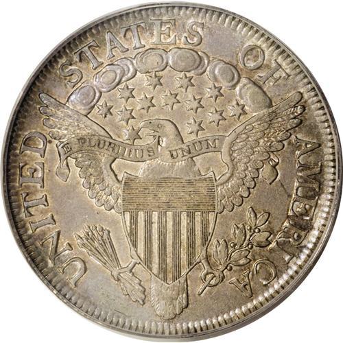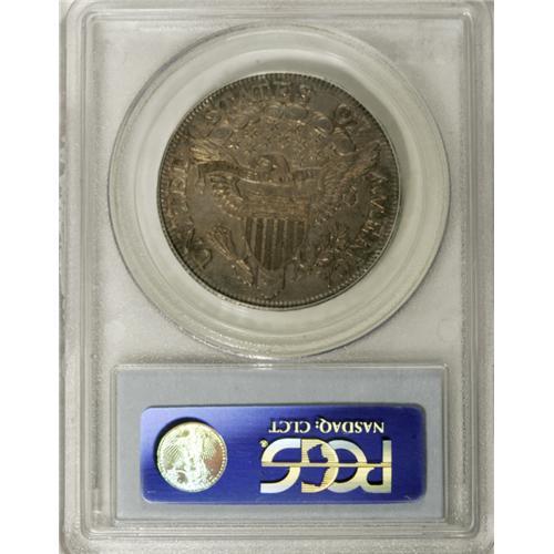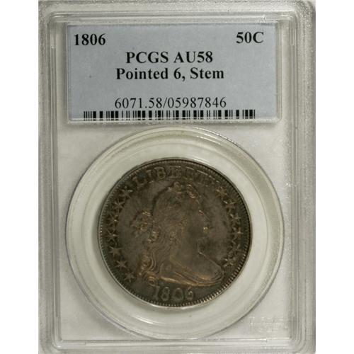 <B>1806 50C Pointed 6, Stem AU58 PCGS.</B></I> O-115, R.1. A crack travels from the base of the date to the left of the first few stars, as seen on most specimens, and branches into another crack that extends through the first five stars. The reverse shows five berries, with the lower one lacking a stem. This early to intermediate die state has not developed the more extensive cracks on both obverse and reverse that are diagnostic of O-115a. Light golden-gray patination displays accents of mauve and sky-blue, and luster in the recessed areas. Well defined motifs and relatively strong dentilation are apparent on both sides, and the surfaces are exceptionally clean.<BR><BR><b>Shipping:</b> Coins & Currency (<a target="_blank" href="http://www.heritageauctions.com/common/shipping.php">view shipping information</a>)