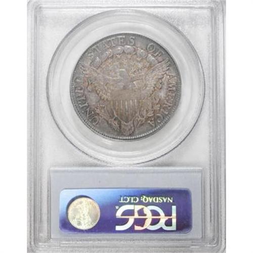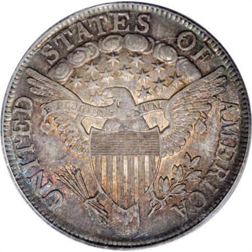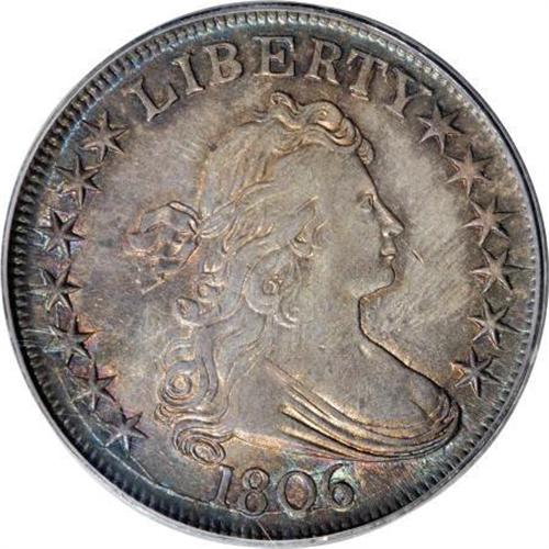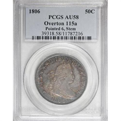 <B>1806 50C Pointed 6, Stem AU58 PCGS.</B></I> O-115a, R.2. A textbook example of this later die state with heavy die cracks on the left side of the obverse, and a definite crack at the top of STATES. The crack down to UNITED has not been seen, even though it is mentioned in the Overton reference. <BR> A significant amount of mint luster underlies the rich toning that covers each side. The central portions are gray-rose, while the margins are deep blue. A bit softly struck in the usual places, as one would expect from this much-used die pairing. Close to Condition Census quality, this piece has eye appeal that transcends that of many pieces that are technically graded Mint State.<BR> Haseltine-15, Beistle 3b-Ea, Overton-30, PCGS # 39318, Encyclopedia-4591.<BR><I>From The Westmoreland County Collection of Early Bust Halves, 1794-1807.</B></I><BR><BR><B>Coin Engraver:</B> Robert Scot<BR><BR><b>Shipping:</b> Coins & Currency (<a target="_blank" href="http://www.heritageauctions.com/common/shipping.php">view shipping information</a>)