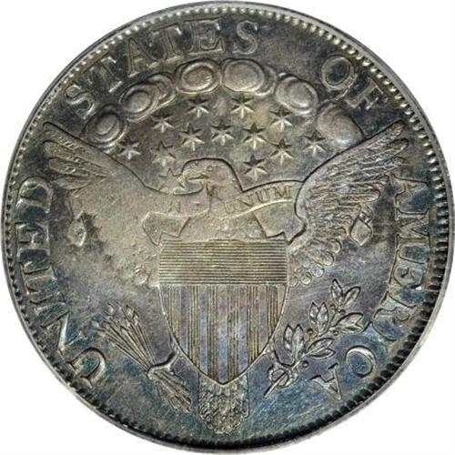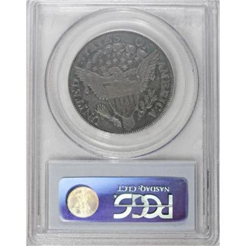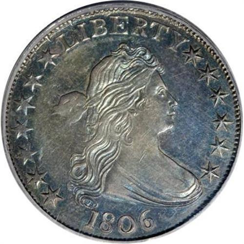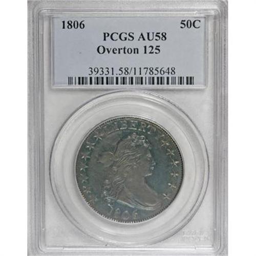 <B>1806 50C Pointed 6, Stem AU58 PCGS.</B></I> O-125a, R.5. The obverse of O-125 has an elongated border segment between star 7 and L. This obverse was also used for O-109, suggesting the two varieties were coined at about the same time. In fact, O-125 was actually struck before O-109. The reverse has a die crack between O and F, with small die chips joining the crack and right side of the O. Most of the other cracks for O-125a are present.<BR> This stunning near-Mint half dollar has fully prooflike fields on both sides, somewhat subdued by intense sea-green and violet-brown toning on both sides.<BR> This is apparently the finest known example of the O-125 die marriage, regardless of die state. An AU50 and an XF45 are the second and third finest that we know of.<BR> PCGS # 6071, Encyclopedia-4591.<BR><I>Ex: Stack's (3/1998), lot 498.<BR>From The Westmoreland County Collection of Early Bust Halves, 1794-1807.</B></I><BR><BR><B>Coin Engraver:</B> Robert Scot<BR><BR><b>Shipping:</b> Coins & Currency (<a target="_blank" href="http://www.heritageauctions.com/common/shipping.php">view shipping information</a>)