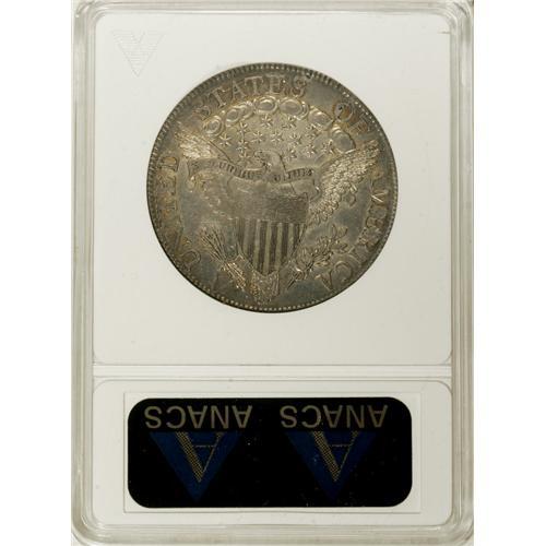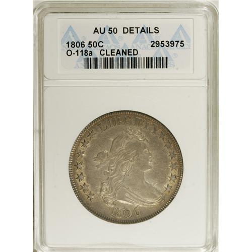 <B>1806 50C Pointed 6, Stem--Cleaned--ANACS. AU50 Details.</B></I> O-118a, R.3. Luster bathes the devices and borders of this light honey-gold Bust half. Inoffensively cleaned, and the only mentionable mark is on the 1 in the date. The reverse die exhibits numerous cracks, and is nearly shattered.<BR><I>From The Hoosier Discovery Collection.</B></I><BR><BR><b>Shipping:</b> Coins & Currency (<a target="_blank" href="http://www.heritageauctions.com/common/shipping.php">view shipping information</a>)