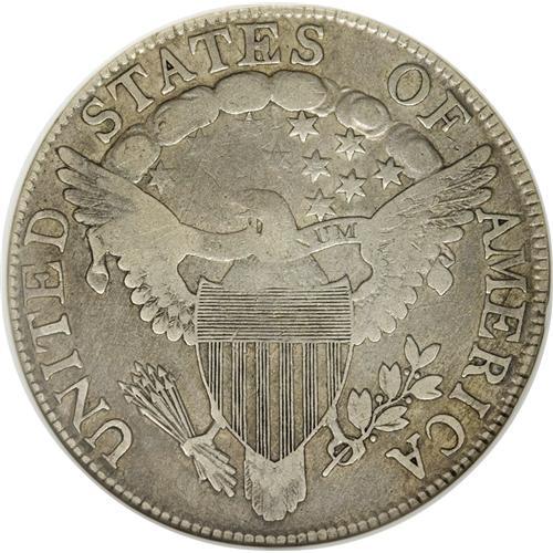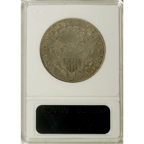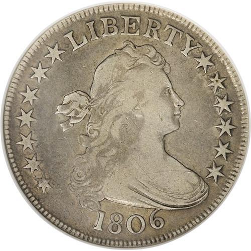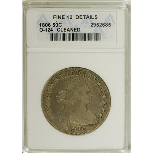 <B>1806 50C Pointed 6, Stem--Cleaned--ANACS. Fine 12 Details.</B></I> O-124, R.6. The 1806 half dollar with the E over A in STATES is one of the great unheralded rarities in the Draped Bust series. This lilac-gray and khaki-gold example is minutely granular from a cleaning, and the left-side reverse stars are soft, but there are no mentionable marks.<BR><BR><b>Shipping:</b> Coins & Currency (<a target="_blank" href="http://www.heritageauctions.com/common/shipping.php">view shipping information</a>)