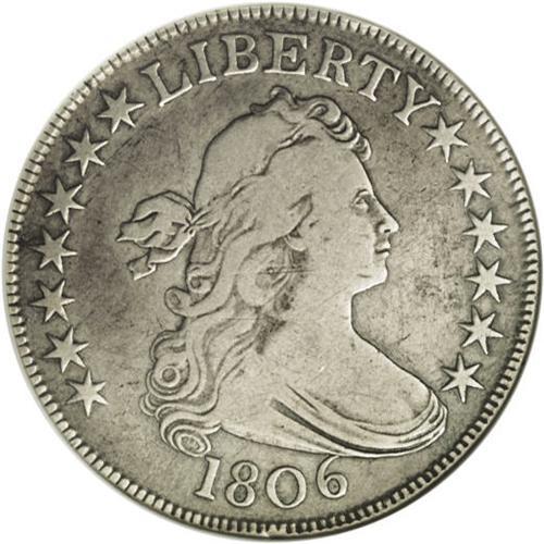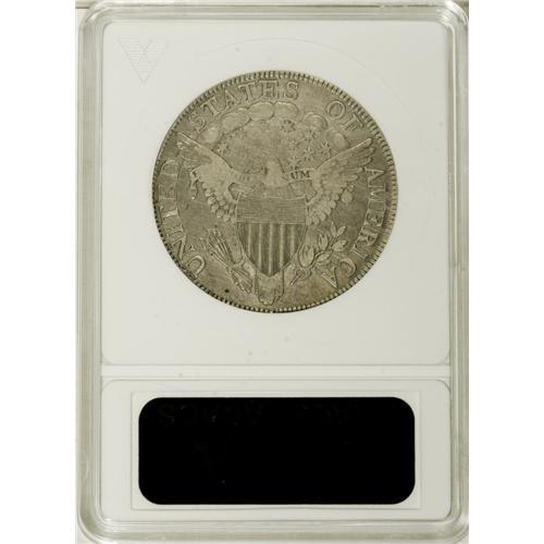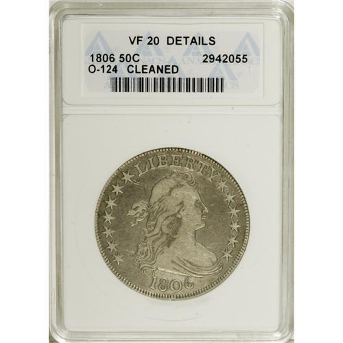 <B>1806 50C Pointed 6, Stem--Cleaned--ANACS. VF20 Details.</B></I> O-124, R.6. This is the very rare variety with the E over A in STATES. This variety is mentioned in the <I>Guide Book,</B></I> but does not receive a separate listing, unlike the similar 1814 E over A O-108. This slate-gray piece is thickly hairlined and has a couple of unimportant edge nicks, but has ample remaining detail, with the diagnostic E over A clear.<BR><BR><b>Shipping:</b> Coins & Currency (<a target="_blank" href="http://www.heritageauctions.com/common/shipping.php">view shipping information</a>)