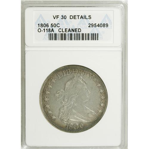 <B>1806 50C Pointed 6, Stem--Cleaned--ANACS. VF30 Details.</B></I> O-118a. NGC Census: (216/753). PCGS Population (85/420). Mintage: 839,576. Numismedia Wsl. Price: $690. (#6071)<BR><BR><b>Shipping:</b> Coins & Currency (<a target="_blank" href="http://www.heritageauctions.com/common/shipping.php">view shipping information</a>)