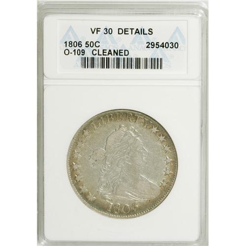 <B>1806 50C Pointed 6, Stem--Cleaned--ANACS. VF30 Details.</B></I> O-109. NGC Census: (216/753). PCGS Population (85/420). Mintage: 839,576. Numismedia Wsl. Price: $690. (#6071)<BR><BR><b>Shipping:</b> Coins & Currency (<a target="_blank" href="http://www.heritageauctions.com/common/shipping.php">view shipping information</a>)