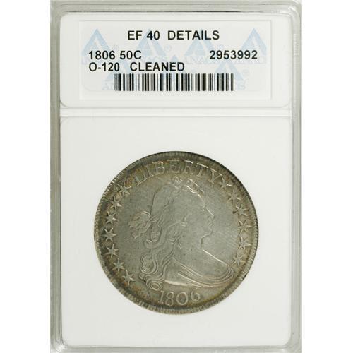 <B>1806 50C Pointed 6, Stem--Cleaned--ANACS. XF40 Details.</B></I> O-120. NGC Census: (88/449). PCGS Population (65/293). Mintage: 839,576. Numismedia Wsl. Price: $1,200. (#6071)<BR><BR><b>Shipping:</b> Coins & Currency (<a target="_blank" href="http://www.heritageauctions.com/common/shipping.php">view shipping information</a>)