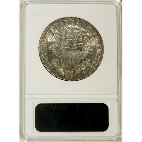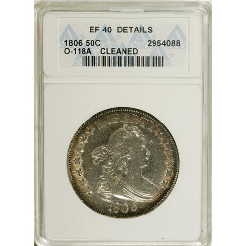 <B>1806 50C Pointed 6, Stem--Cleaned--ANACS. XF40 Details.</B></I> O-118a, R.3. The borders are toned in golden-brown and sea-green, although the fields and devices are overly bright. A small dig near the forehead merits mention, but there are no other marks. A late die state with numerous interesting cracks and clashes.<BR><I>From The Hoosier Discovery Collection.</B></I><BR><BR><b>Shipping:</b> Coins & Currency (<a target="_blank" href="http://www.heritageauctions.com/common/shipping.php">view shipping information</a>)