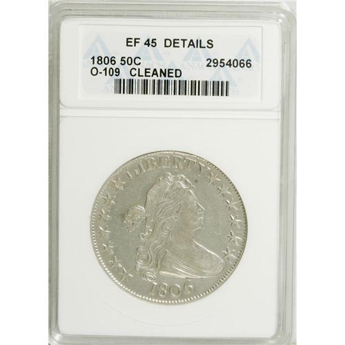 <B>1806 50C Pointed 6, Stem--Cleaned--ANACS. XF45 Details.</B></I> O-109. NGC Census: (127/322). PCGS Population (66/227). Mintage: 839,576. Numismedia Wsl. Price: $1,743. (#6071)<BR><BR><b>Shipping:</b> Coins & Currency (<a target="_blank" href="http://www.heritageauctions.com/common/shipping.php">view shipping information</a>)