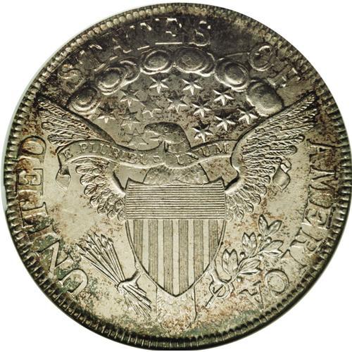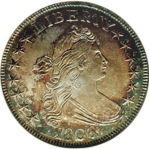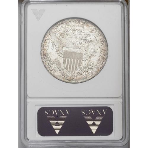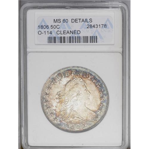 <B>1806<50C> Pointed 6, Stem--Cleaned--ANACS. MS60 Details.</B></I> O-114, R.4. A very scarce die variety with a heavily recut TY in LIBERTY, from the die state before the reverse die was bisected with a crack. Pleasing although a few minor cleaning lines are confined mostly to the obverse. The obverse has retoned with sea-green color at the outer border, lined with russet-gold and orange. The reverse is much lighter in tone. A well defined, high grade example.<BR><I>From The Frank DuVall Collection.</B></I>