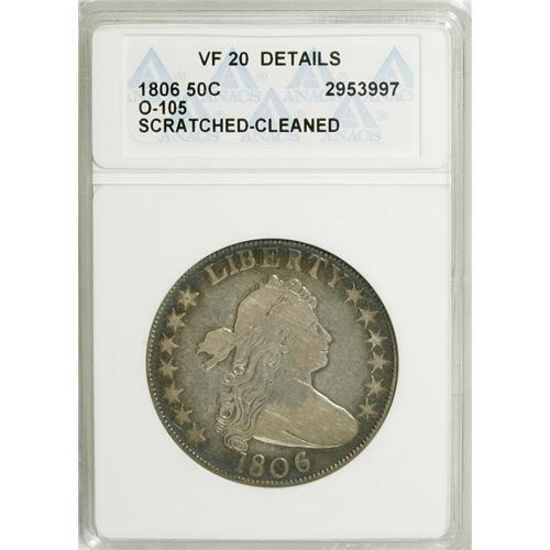 <B>1806 50C Pointed 6, Stem--Cleaned, Scratched--ANACS. VF20 Details.</B></I> O-105. NGC Census: (216/969). PCGS Population (54/558). Mintage: 839,576. Numismedia Wsl. Price: $350. (#6071)<BR><BR><b>Shipping:</b> Coins & Currency (<a target="_blank" href="http://www.heritageauctions.com/common/shipping.php">view shipping information</a>)