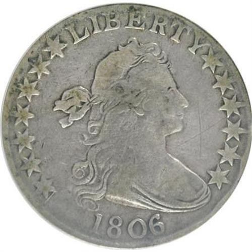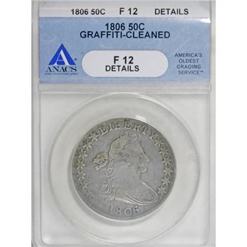 <B>1806 50C Pointed 6, Stem--Cleaned, Graffiti--ANACS. Fine 12 Details.</B></I> NGC Census: (34/824). PCGS Population (42/662). Mintage: 839,576. Numismedia Wsl. Price for NGC/PCGS coin in F12: $250. (#6071)<BR><BR><B>Coin Engraver:</B> Robert Scot<BR><BR><b>Shipping:</b> Coins & Currency (<a target="_blank" href="http://www.heritageauctions.com/common/shipping.php">view shipping information</a>)