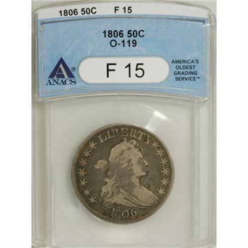 <B>1806 50C Pointed 6, Stem F15 ANACS.</B></I> O-119. NGC Census: (36/772). PCGS Population (52/599). Mintage: 839,576. Numismedia Wsl. Price for NGC/PCGS coin in F15: $294. (#6071)<BR><BR><B>Coin Engraver:</B> Robert Scot<BR><BR><b>Shipping:</b> Coins & Currency (<a target="_blank" href="http://www.heritageauctions.com/common/shipping.php">view shipping information</a>)