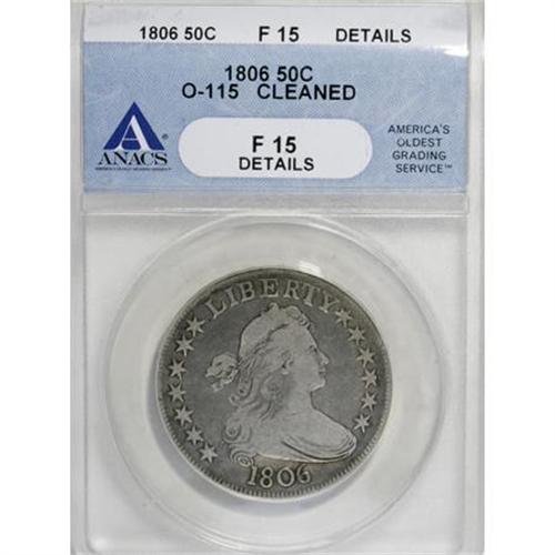 <B>1806 50C Pointed 6, Stem--Cleaned--ANACS. Fine 15 Details.</B></I> O-115. NGC Census: (38/783). PCGS Population (53/611). Mintage: 839,576. Numismedia Wsl. Price for NGC/PCGS coin in F15: $303. (#6071)<BR><BR><B>Coin Engraver:</B> Robert Scot<BR><BR><b>Shipping:</b> Coins & Currency (<a target="_blank" href="http://www.heritageauctions.com/common/shipping.php">view shipping information</a>)