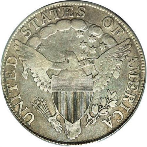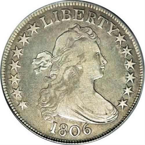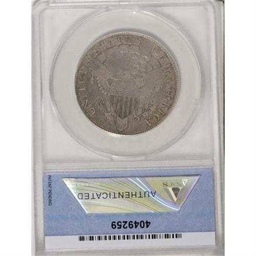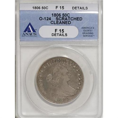 <B>1806 50C Pointed 6, Stem--Cleaned--ANACS. Fine 15 Details.</B></I> O-124, R.6. The 1 and 6 in the date are attached to the curl and the bust, and star 13 is quite close to the bust. The reverse shows the E in STATES clearly over an A, and there are five berries, the upper two directly opposite each other and lacking stems. Lightly cleaned silver-gray surfaces reveal some faint pinscratches. Well defined design features. A nice piece overall, despite the relatively minor impairments.<BR><BR><B>Coin Engraver:</B> Robert Scot<BR><BR><b>Shipping:</b> Coins & Currency (<a target="_blank" href="http://www.heritageauctions.com/common/shipping.php">view shipping information</a>)