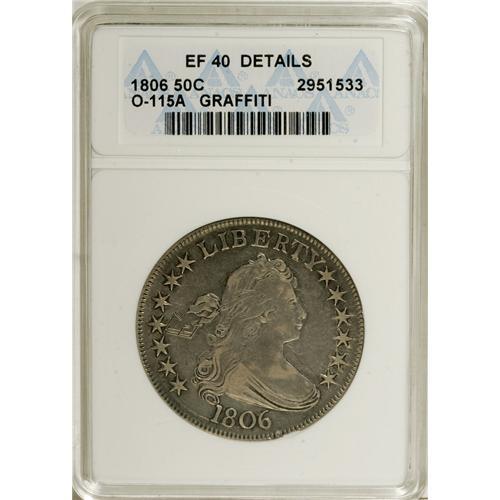 <B>1806 50C Pointed 6, Stem--Graffiti--ANACS. XF40 Details.</B></I> O-115a, R.2. NGC Census: (88/449). PCGS Population (65/293). Mintage: 839,576. Numismedia Wsl. Price: $1,200. (#6071)<BR><BR><b>Shipping:</b> Coins & Currency (<a target="_blank" href="http://www.heritageauctions.com/common/shipping.php">view shipping information</a>)