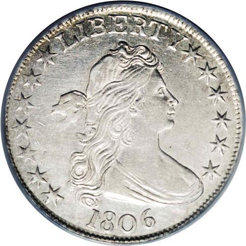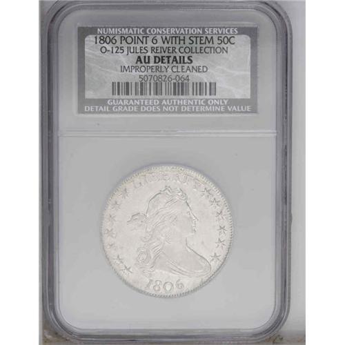 <B>1806<50C> Pointed 6, Stem. O-125, R.5. AU Details, Improperly Cleaned, NCS.</B></I> The die crack from the rim right of the O in OF is attached to the O by a small break. This lightly toned representative has vibrant luster throughout recessed areas of the devices, and aside from faint pinscratches near the mouth, on the cheekbone, and on the neck, there are no singular marks. The obverse field has a mildly grainy texture, and the piece has likely been dipped in its past.<BR><I>Ex: Michael (9/1991).</B></I> Envelope Included.