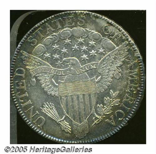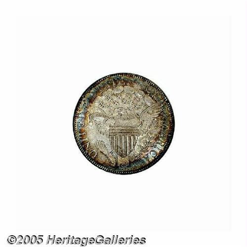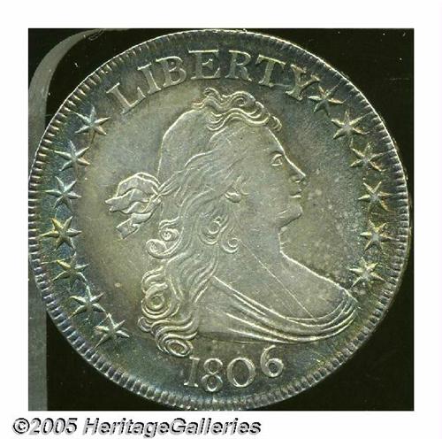 <B>1806<50C> Pointed 6, Stem MS60 Obverse Scratched Uncertified.</B></I> O-120, R.3. Beautiful sea-green, powder-blue, golden-brown, and rose colors illuminate this well struck Mint State Draped Bust Half Dollar. Not the comparatively common O-109, O-120 is scarce and identified by lengthy die engraver lines (as made) from the tips of the shield corners. An impressive piece at first glance, a pair of parallel scratches from the bust truncation to the neck are apparent upon further study.