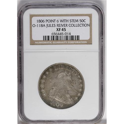 <B>1806<50C> Pointed 6, Stem XF45 NGC.</B></I> Ex: Jules Reiver Collection. O-118a, R.3. A pleasing piece that comes from the earliest die state of O-118a. This Choice XF piece has even slate-gray color, and the only distraction is a group of tiny dark toning flecks near Liberty's profile.