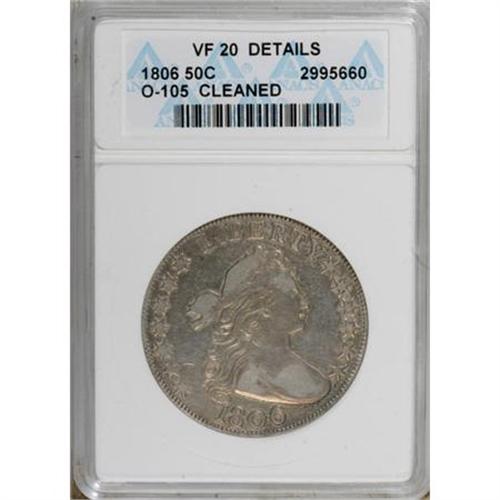 <B>1806 50C Pointed 6, Stem--Cleaned--ANACS. VF20 Details.</B></I> O-105. NGC Census: (48/717). PCGS Population (55/556). Mintage: 839,576. Numismedia Wsl. Price for NGC/PCGS coin in VF20: $350. (#6071)<BR><BR><B>Coin Engraver:</B> Robert Scot<BR><BR><b>Shipping:</b> Coins & Currency (<a target="_blank" href="http://www.heritageauctions.com/common/shipping.php">view shipping information</a>)