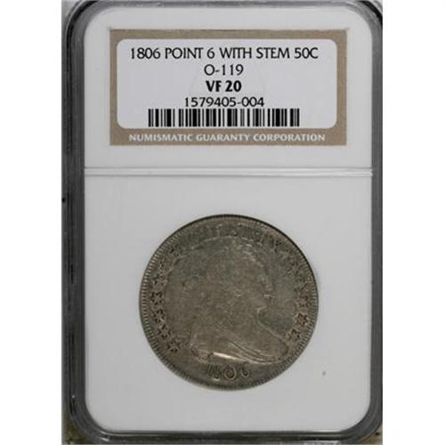 <B>1806 50C Pointed 6, Stem VF20 NGC.</B></I> O-119. NGC Census: (51/730). PCGS Population (55/556). Mintage: 839,576. Numismedia Wsl. Price for NGC/PCGS coin in VF20: $400. (#6071)<BR><BR><B>Coin Engraver:</B> Robert Scot<BR><BR><b>Shipping:</b> Coins & Currency (<a target="_blank" href="http://www.heritageauctions.com/common/shipping.php">view shipping information</a>)