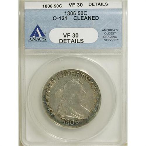 <B>1806 50C Pointed 6, Stem--Cleaned--ANACS. VF30 Details.</B></I> O-121. NGC Census: (64/632). PCGS Population (85/420). Mintage: 839,576. Numismedia Wsl. Price for NGC/PCGS coin in VF30: $815. (#6071)<BR><BR><B>Coin Engraver:</B> Robert Scot<BR><BR><b>Shipping:</b> Coins & Currency (<a target="_blank" href="http://www.heritageauctions.com/common/shipping.php">view shipping information</a>)