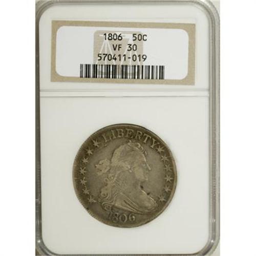 <B>1806 50C Pointed 6, Stem VF30 NGC.</B></I> O-121, R.4. A scarce die marriage that combines a nearly shattered obverse die with the reverse of O-117. This is a richly detailed and problem-free piece. The reverse of the holder is hazy, which unfairly makes the reverse itself appear to be blurry.<BR><BR><b>Shipping:</b> Coins & Currency (<a target="_blank" href="http://www.heritageauctions.com/common/shipping.php">view shipping information</a>)