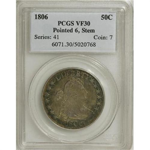 <B>1806 50C Pointed 6, Stem VF30 PCGS.</B></I> PCGS Population (83/410). NGC Census: (64/621). Mintage: 839,576. Numismedia Wsl. Price for NGC/PCGS coin in VF30: $725. (#6071)<BR><BR><B>Coin Engraver:</B> Robert Scot<BR><BR><b>Shipping:</b> Coins & Currency (<a target="_blank" href="http://www.heritageauctions.com/common/shipping.php">view shipping information</a>)