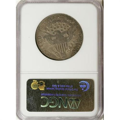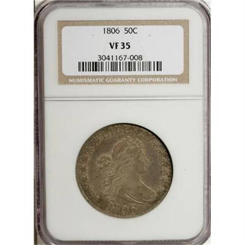 <B>1806 50C Pointed 6, No Stem VF35 NGC.</B></I> O-109, R.1. The date shows a pointed 6, and there is not a stem through the eagle's right (facing) claw. This unabraded example displays appropriate wear for the grade and surprising glints of luster, along with amber-gold color; both of which are more noticeable on the obverse. <BR><BR><B>Coin Engraver:</B> Robert Scot<BR><BR><b>Shipping:</b> Coins & Currency (<a target="_blank" href="http://www.heritageauctions.com/common/shipping.php">view shipping information</a>)