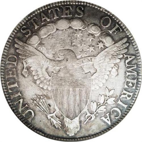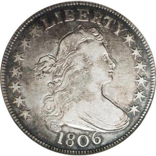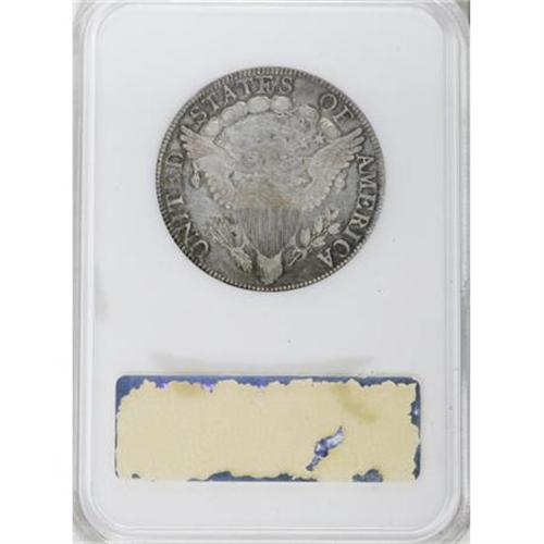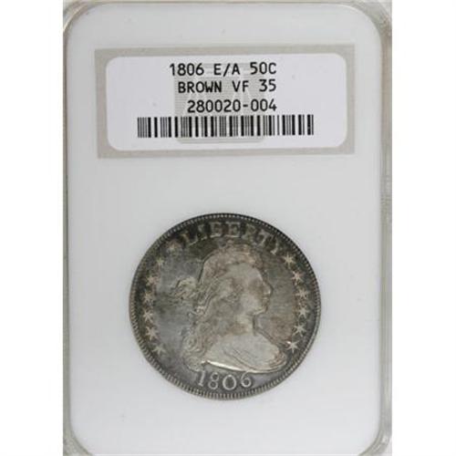 <B>1806 50C Pointed 6, Stem VF35 NGC.</B></I> O-124, R.6. The E over A variety, also known as the STATES over STATAS variety, is a rarity that is mentioned in the <I>Guide Book</B></I> as a footnote to the Pointed 6 half dollars, but deserves its own listing. Similar varieties are known for 1795 and 1814 half dollars, the latter having a separate <I>Guide Book</B></I> listing.<BR> Considerable light silver surfaces with splashes of gunmetal-blue and light gold toning near the borders on both sides.<BR> A major rarity and important blundered die variety, with a total surviving population of just 25 to 30 coins in all grades. This piece is a Census level example, probably third or fourth finest.<BR> Beistle 6-l, PCGS # 6071, Encyclopedia-4592.<BR><I>Ex: Sheridan Downey (5/2004).<BR>From The Westmoreland County Collection of Early Bust Halves, 1794-1807.</B></I><BR><BR><B>Coin Engraver:</B> Robert Scot<BR><BR><b>Shipping:</b> Coins & Currency (<a target="_blank" href="http://www.heritageauctions.com/common/shipping.php">view shipping information</a>)