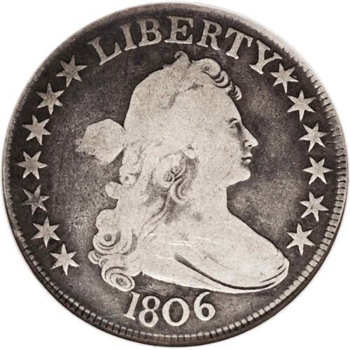 <B>1806<50C> Pointed 6, Stem. O-122, High R.6. VG10 NGC.</B></I> This rare die variety is identified by a bold vertical die crack from the reverse rim past 6 o'clock, up along the left tail feathers, and through the shield along the outer third stripe. Overton mentions a second crack, from the fletchings to the base of U to the left ribbon end, also present here. A prominent clashmark right of the M in UNUM is also noted. Although it does not sport a high numerical grade, the current example shows the important die characteristics, and has full rims aside from the tops of ERIC in AMERICA. This may be the latest known state. The area between the die crack and the left most gule of the third stripe is entirely broken away. The horizontal shield lines left of the crack are on a higher plane, thus receiving more wear, and appearing here with little detail. Stephen Herrman reports that 15 examples of this variety are known, with a few in higher grades. This example probably just misses the top six for the die marriage.<BR><I>Ex: Larry Briggs (2/1989).</B></I> Envelope Included.