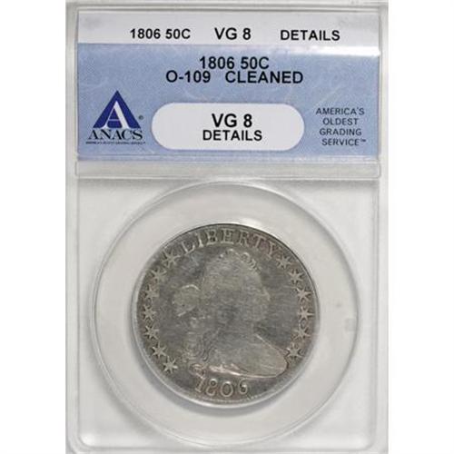 <B>1806 50C Pointed 6, Stem--Cleaned--ANACS. VG8 Details.</B></I> O-109. NGC Census: (18/879). PCGS Population (11/729). Mintage: 839,576. Numismedia Wsl. Price for NGC/PCGS coin in VG8 : $180. (#6071)<BR><BR><B>Coin Engraver:</B> Robert Scot<BR><BR><b>Shipping:</b> Coins & Currency (<a target="_blank" href="http://www.heritageauctions.com/common/shipping.php">view shipping information</a>)