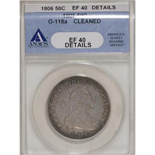 <B>1806 50C Pointed 6, Stem--Cleaned--ANACS. XF40 Details.</B></I> O-118a. NGC Census: (93/461). PCGS Population (67/281). Mintage: 839,576. Numismedia Wsl. Price for NGC/PCGS coin in XF40: $1,400. (#6071)<BR><BR><B>Coin Engraver:</B> Robert Scot<BR><BR><b>Shipping:</b> Coins & Currency (<a target="_blank" href="http://www.heritageauctions.com/common/shipping.php">view shipping information</a>)