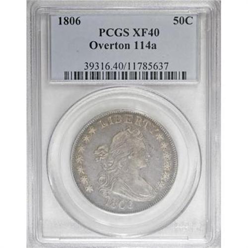 <B>1806 50C Pointed 6, Stem XF40 PCGS.</B></I> O-114a, R.5.<B> </B></I>The reverse die crack is fully developed on this piece. Blobs are beginning to appear through the E in AMERICA, as on the previous piece. <BR> The surfaces are lovely and original. Each side has medium density gray patina in the fields and within the recesses of the design elements. The highpoints are brilliant with just a touch of rose. Minimally abraded with the only mentionable marks being a mark in the right obverse field with a shallow planchet flaw above. On the reverse the only mark is placed diagonally across the second set of vertical stripes on the shield. <BR> Tied with several other 40/40 coins in the lower part of the Condition Census. <BR> Beistle 3-D, Overton-25, PCGS # 39316, Encyclopedia-4591.<BR> <I>Ex: Brad Higgins.<BR>From The Westmoreland County Collection of Early Bust Halves, 1794-1807.</B></I><BR><BR><B>Coin Engraver:</B> Robert Scot<BR><BR><b>Shipping:</b> Coins & Currency (<a target="_blank" href="http://www.heritageauctions.com/common/shipping.php">view shipping information</a>)