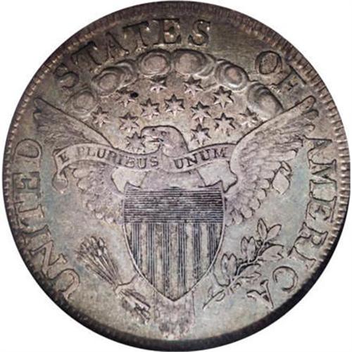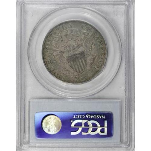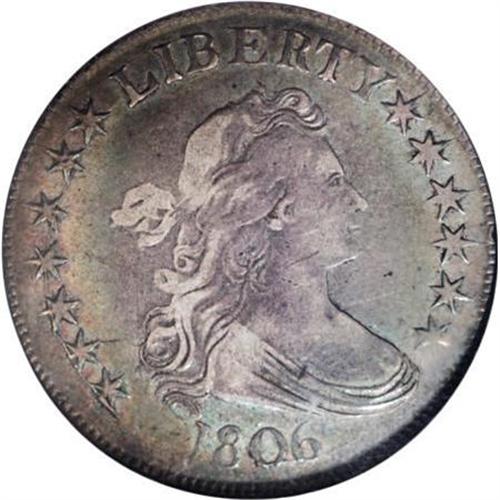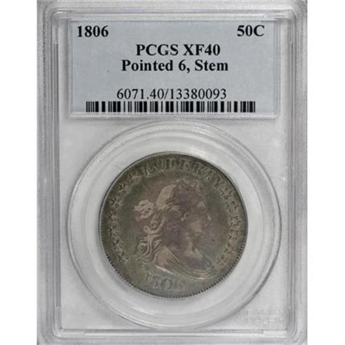 <B>1806 50C Pointed 6, Stem XF40 PCGS.</B></I> O-117, Low R.5. Final use of Obverse 9 and the first of two pairings of Reverse M. In this use of Obverse 9, there is no trace of the repunching on TY, as seen on previous die marriages. Rather, the obverse is attributable by the branched die cracks to the left of the date and the heavy crack at the bottom of the digits. The reverse is most easily attributed by the point of the eagle's beak that is buried in the upper side of star 12. <BR> While this piece is deeply toned, the colors show a surprising bright iridescence. Most of each side is gray-rose, but there are rich shades of sea-green and bright yellow also present. Weakly struck on the obverse, as one would expect from this heavily used die. The reverse, on the other hand, is much better defined relative to the obverse. Identifiable by a faint, shallow scratch along the back of the jawline and a couple of tiny milling marks on the neck of Liberty. <BR> Rated R.4 in the fourth edition on Overton. However, the lack of actual appearances of this variety make the 117 a Low R.5. According to Stephen Herrman's census, only one coin has appeared at auction or mail bid that is finer than this piece, and that coin was XF45. If this piece is second finest, the remainder of the Condition Census consists of three 30/30 pieces. The known examples then drop down to the 08/08 level. <BR> Beistle 7a-G, Overton-32, PCGS # 6071, Encyclopedia-4591.<BR> <I>Ex: Michael Summers (5/2004).<BR>From The Westmoreland County Collection of Early Bust Halves, 1794-1807.</B></I><BR><BR><B>Coin Engraver:</B> Robert Scot<BR><BR><b>Shipping:</b> Coins & Currency (<a target="_blank" href="http://www.heritageauctions.com/common/shipping.php">view shipping information</a>)
