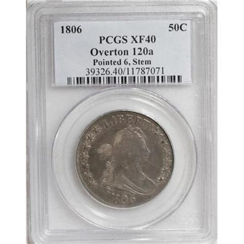 <B>1806 50C Pointed 6, Stem XF40 PCGS.</B></I> O-120a, R.4. A later die state with the reverse shield break quite advanced, now covering the tops of stripes 4 and 5, and nearly reaching stripe 6. Additional die cracks from the ribbon end to AM has formed a retained cud. Extensive obverse cracks are partially obscured by heavy peripheral flow lines. A pleasing lightly circulated piece with pale blue, tan, and iridescent surfaces. A small mark is evident in the left obverse field.<BR><I>From The Westmoreland County Collection of Early Bust Halves, Part Two.</B></I><BR><BR><b>Shipping:</b> Coins & Currency (<a target="_blank" href="http://www.heritageauctions.com/common/shipping.php">view shipping information</a>)