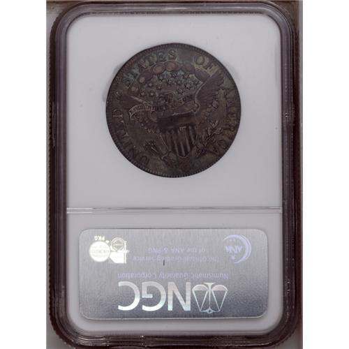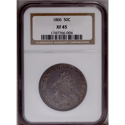 <B>1806 50C Pointed 6, Stem XF45 NGC.</B></I> O-120a, R.4. Deeply toned in sea-green and lavender, with a moderate amount of wear for the assigned grade. The die break on the shield between vertical stripes 4 and 5 identifies this later die state. This example is struck a degree or two off-center toward 2 o'clock, although only the right-side denticles are affected.