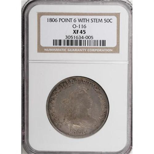 <B>1806 50C Pointed 6, Stem XF45 NGC.</B></I> O-116, R.3. Attributed by a die crack running from the bottom of the date through the stars along the left border. A branch of the crack extends between the rim and the stars to the bottom left of star 3. On the reverse, the lowest of the 5 berries has no stem, and the upper two have heavy stems. The violet-gray surfaces display traces of darker patina near the peripheries. The design elements are well struck, and surface marks are minimal. <BR><BR><B>Coin Engraver:</B> Robert Scot<BR><BR><b>Shipping:</b> Coins & Currency (<a target="_blank" href="http://www.heritageauctions.com/common/shipping.php">view shipping information</a>)