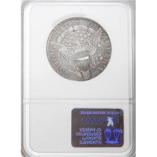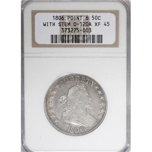 <B>1806 50C Pointed 6, Stem XF45 NGC.</B></I> O-120a, R.4. A late die state, the reverse die break now joins 18 pales of gules 2 through 6 with a secondary break joining the two lowest crossbars from the left shield border to a point above the rightmost element of stripe 1. All other breaks described in Overton seem to be present on this piece, the terminal die state for O-120.<BR> Attractive pewter-gray surfaces with lighter silver on the devices, surrounded by wisps of gold toning near the borders. Traces of peripheral luster remain on both sides.<BR> Although O-120 is considered a plentiful R.3 die marriage, the terminal die state pieces are extremely rare. Probably just a dozen exist in all grades.<BR> Haseltine-8, Beistle 4b-Kb, Overton-39, PCGS # 6071, Encyclopedia-4591.<BR><I>Ex: Premier Numismatics (4/1999).<BR>From The Westmoreland County Collection of Early Bust Halves, 1794-1807.</B></I><BR><BR><B>Coin Engraver:</B> Robert Scot<BR><BR><b>Shipping:</b> Coins & Currency (<a target="_blank" href="http://www.heritageauctions.com/common/shipping.php">view shipping information</a>)