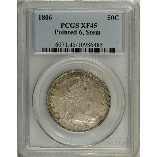 <B>1806 50C Pointed 6, Stem XF45 PCGS.</B></I> O-115, R.1. Light golden-brown and aqua-blue freckles grace the obverse border. Luster peers through Liberty's hair, the eagle's wings, and other protected areas.<BR><BR><b>Shipping:</b> Coin/Currency (<a target="_blank" href="http://www.heritageauctions.com/common/shipping.php">view shipping information</a>)