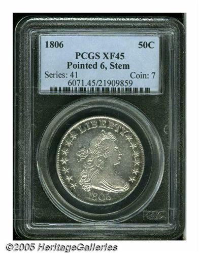 <B>1806<50C> Pointed 6, Stem XF45 PCGS.</B></I> O-116, R.3. Bright surfaces are nearly untoned and display traces of luster in the recessed areas. The design features illustrate sharply detailed, and well centered on the planchet. There are no significant marks to report.