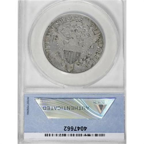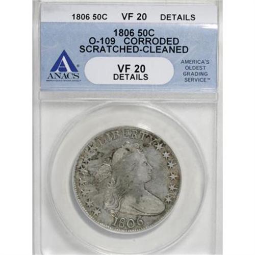 <B>1806 50C Pointed 6, No Stem--Corroded, Scratched, Cleaned--ANACS. VF20 Details.</B></I> O-109, R.1. Generally ivory-gray with peripheral orange-gold toning. A few speckles of dark debris above the hair ribbon are pinscratched from an attempt at removal.<BR><I>From The John Stimson, Sr. Collection, Part Two.</B></I><BR><BR><B>Coin Engraver:</B> Robert Scot<BR><BR><b>Shipping:</b> Coins & Currency (<a target="_blank" href="http://www.heritageauctions.com/common/shipping.php">view shipping information</a>)