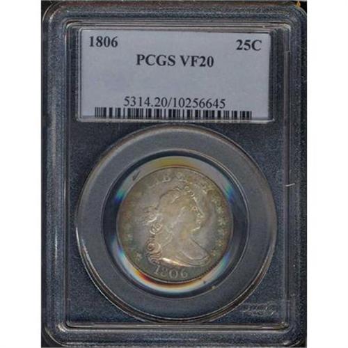 <b>1806 Draped Bust Quarter Dollar. PCGS graded VF20.</b> Smooth surfaces with a little bit more wear on the upper left hand stars than usual for 1806. The reverse has some areas of charcoal gray in the devices <b>(PCGS # 5314)</b>