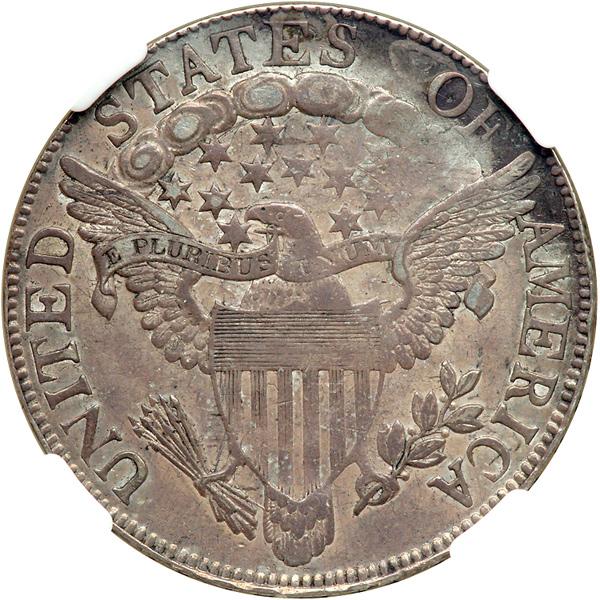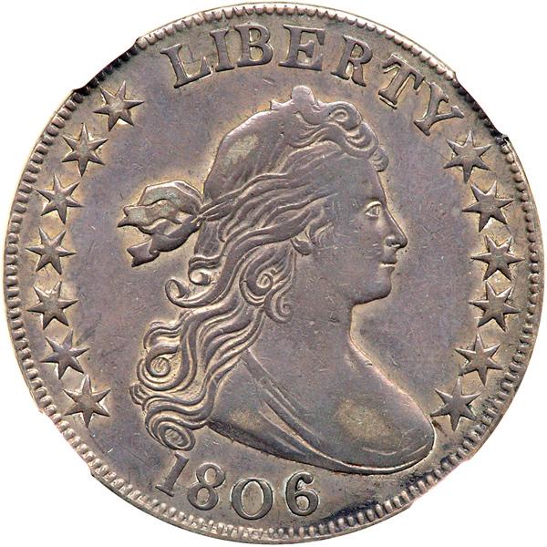 1806 Draped Bust Half Dollar. Knobbed 6, large stars. NGC graded AU-50. Nice even toning on both sides. This Knobbed 6 obverse is immediately identified by the widely recut T of LIBERTY. A very choice example with natural "old silver" characteristics including luster within and around the devices. The choice surface quality seems motivated to induce bidders to increase their bids as though by subtle hypnotism! Pop 1; 1 finer in 53.