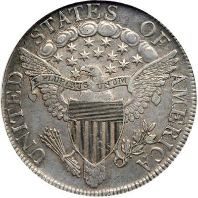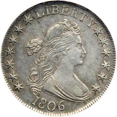 1806 Draped Bust Half Dollar. . O-109, No Stem Through Claw. NGC graded AU-50. Well struck with even medium grey toning and lighter highlights and very sharp devices on both sides. The color is perfect for this small degree of wear, surfaces pleasiing to the eye inasmuch as they are relatively free of circulation marks. One couldn't do better than this for the addition to a U.S. Type Set.